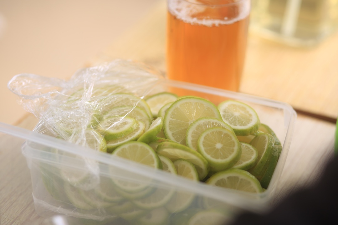 柠檬茶制作现场果香四溢、茶香氤氲。孩子站在小凳上,踮脚用力揉搓柠檬,汁水四溅,酸香扑鼻,家长协助孩子调配甜度。